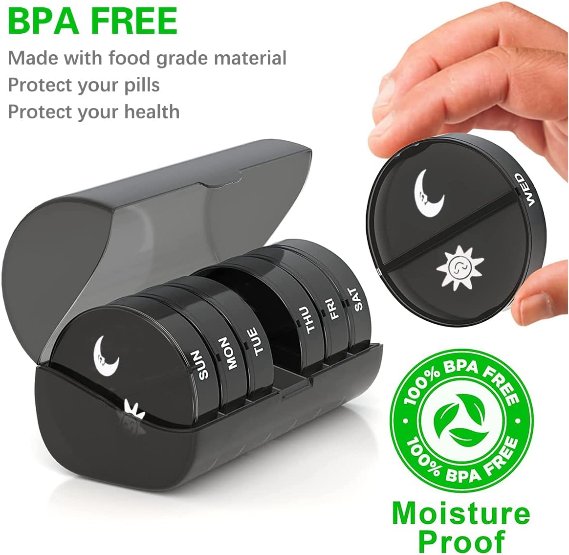 - [Moisture Proof] Our weekly pill case can protect your medicine from moisture. Each separate compartment and reliably sealing clasp keeps the pills dry and cool. Suitable for carrying out and daily home use.