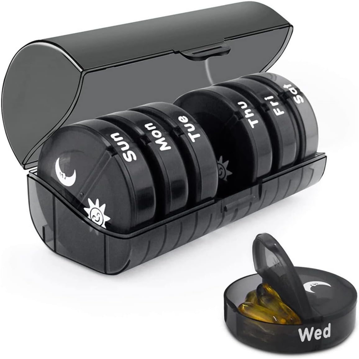 - [Large Capacity Pill Case] The daily pill box organizer has 7 individual daily pills boxes for a week's use, total 14 compartments ( Diameter*height of each compartment: 2.36×0.70 inches/ 6×1.79 cm). Each large pill organizer can hold 6 fish oils or 7 Vitamins or 14 capsules. You could plan your daily vitamin plan by weekly in advance.