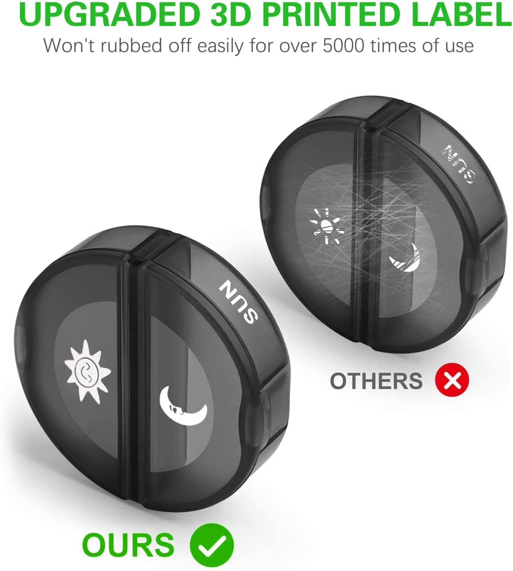 - [Good Medication Reminder Tool] Each compact pill container is printed with the week date and AM/PM icons to avoid confusion. The pill box organizer will track your medicine 2 times a day during the week. One box per day. Simply fill the pill box once a week, which will be a great pill dispenser in your travel, camping, work, and daily life.