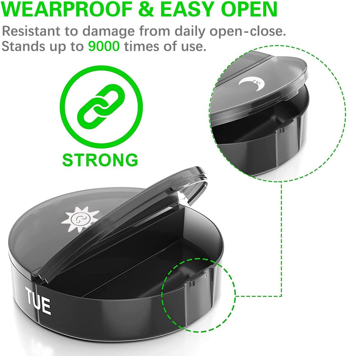 - [Durable and BPA-free] Made of food-grade PP plastic, it is environmentally friendly and practical to ensure your pills are safe to eat, and snap-shut lips can protect your pills from spilling out.