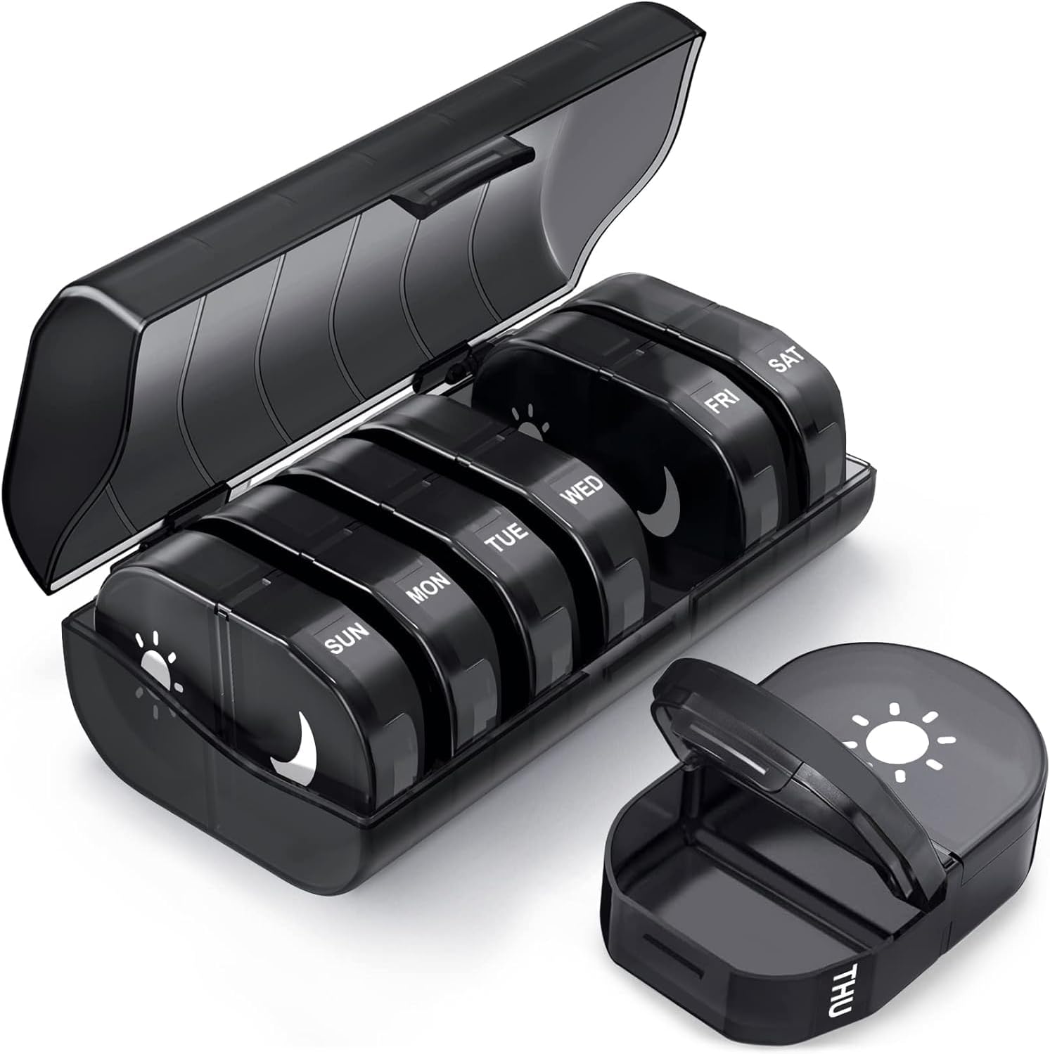 - 💊7-DAY PILL ORGANIZER: AM/PM split pill compartments make planning daily doses easy. Morning/night and day icons help you quickly identify your vitamins, supplements, and medication. Fill once per week and done!
