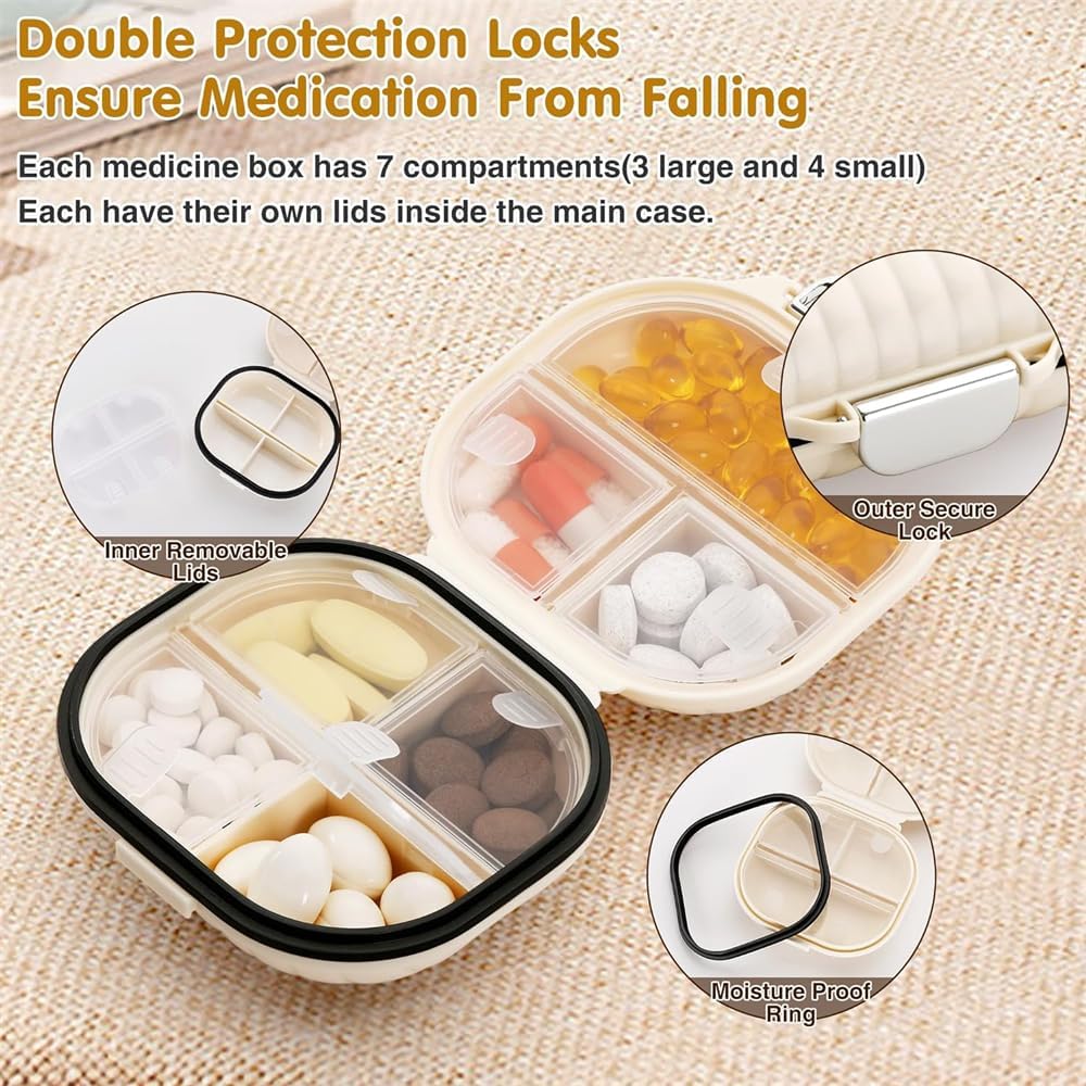 Travel Pill Organizer, 7 Compartments Portable Pill Case, Moisture Proof Small Pill Box for Pocket Purse Daily Pill Case, Portable Medicine Vitamin Holder Container, Travel Essentials, 1 Small+1 Large